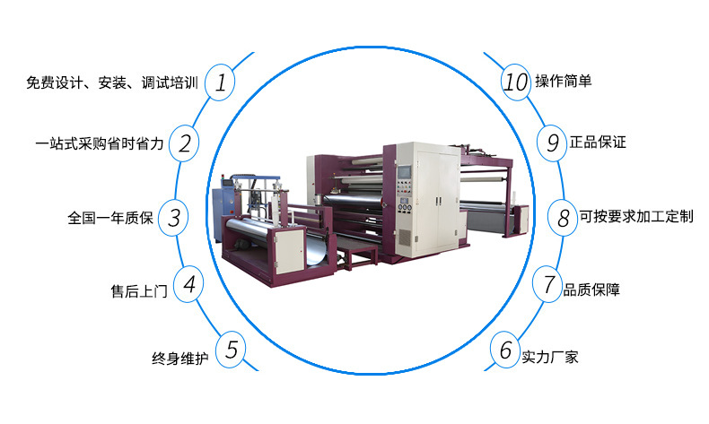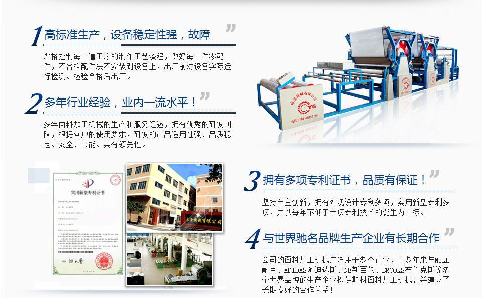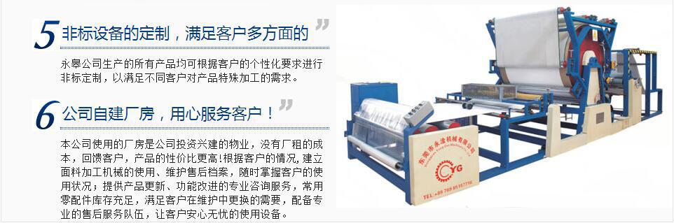 永皋机械公司拥有三十多年丰富的专用设备研发与制造的经验,并不断创新,使产品不断的完善,以满足客户更高的需求!特别在设计制造面料加工机械方面,形成了公司独特的设计理念:就是站在用户的角度考虑,持续强化了产品在节能、安全方面的优势,同时也提升了产品的整体品质。让用户长期使用设备的成本更低、更具竟争力!