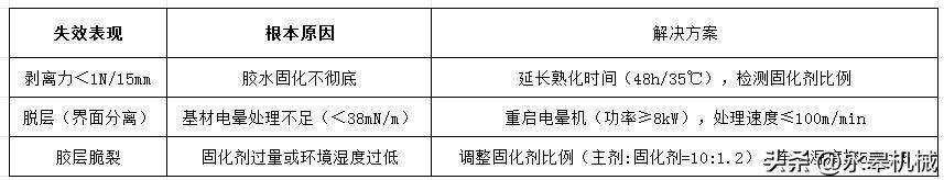 原因:胶水涂布不均、基材表面污染(油污/粉尘)、烘干温度不足、压辊压力不足或老化。